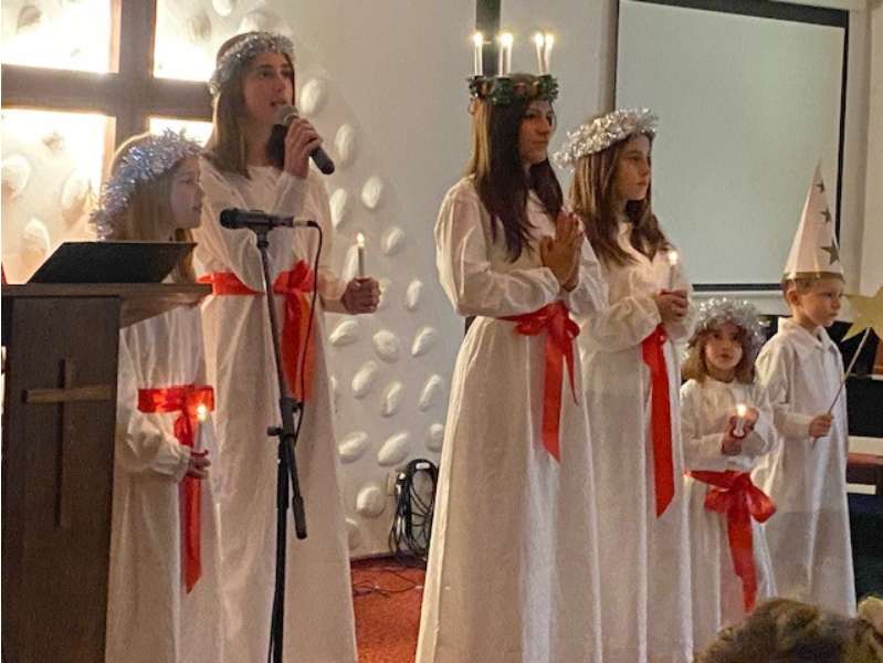 Luciafirande i en fullsatt kyrka. Luciatåget bestod av fyra barn från Teneriffa och två svenska barn på besök. Mycket vackert och stämningsfullt!